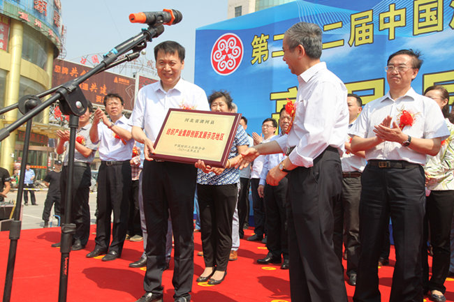 中國紡織工業(yè)聯(lián)合會顧問陳樹津向清河縣人大常委會副主任、清河羊絨制品市場管委會主任孫連嶺頒發(fā)“紡織產(chǎn)業(yè)集群創(chuàng)新發(fā)展地區(qū)”牌匾