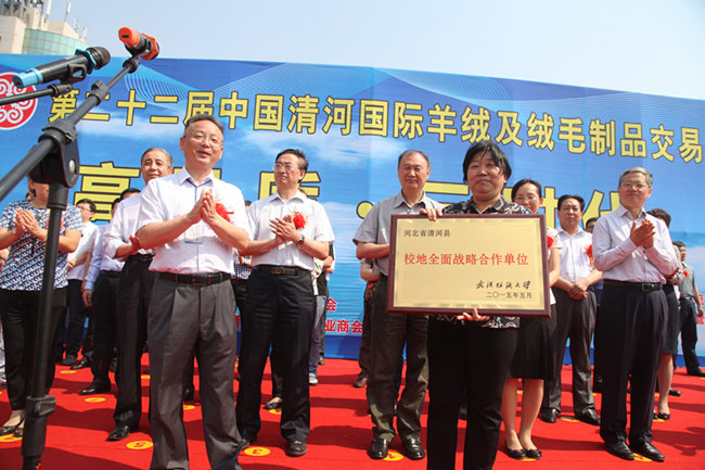 武漢紡織大學(xué)副校長羅錦銀向清河縣副縣長馬鳳閣頒發(fā)“校地全面戰(zhàn)略合作單位”牌匾