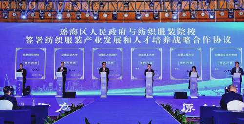 發布會現場還舉行了一系列紡織服裝產業人才簽約和項目合作簽約,標志著瑤海區項目建設與“雙招雙引”同步推進。合肥市瑤海區人民政府與浙江理工大學、安徽農業大學、安徽工程大學、合肥師范學院、安徽職業技術學院,安徽時尚街區與江蘇省、浙江省服裝設計師協會先后簽訂服裝產業人才戰略合作協議。瑤海區人民政府與項目單位,以及“雙招雙引”項目單位簽約達成合作項目。安徽淮浦商業運營管理有限公司與著名設計師簽約達成戰略合作。
