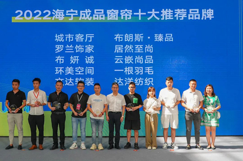 ![]() 活動現場,王一鳴為城市客廳、一根羽毛、布妍誠、達洋紡織、云嵌尚品、環美空間、布朗斯·臻品、羅蘭飾家、居然至尚、文達軟裝2022海寧成品窗簾十大推薦品牌企業授牌。