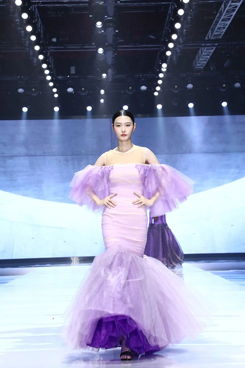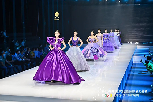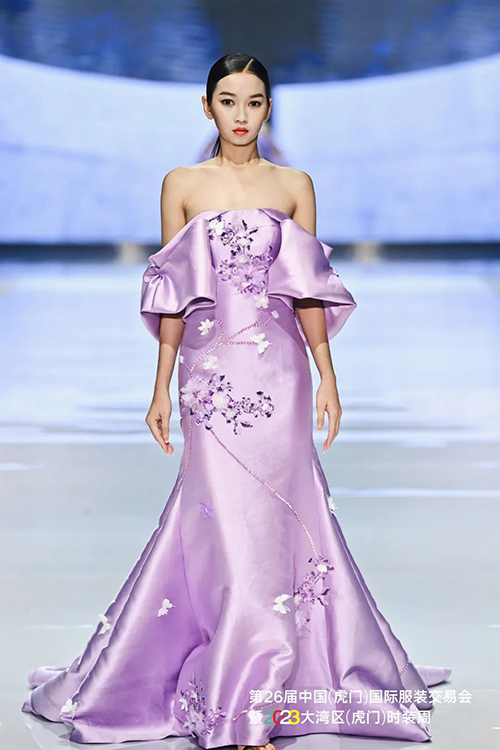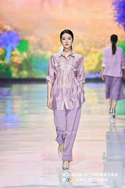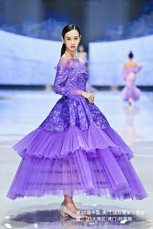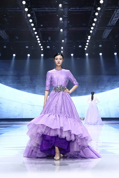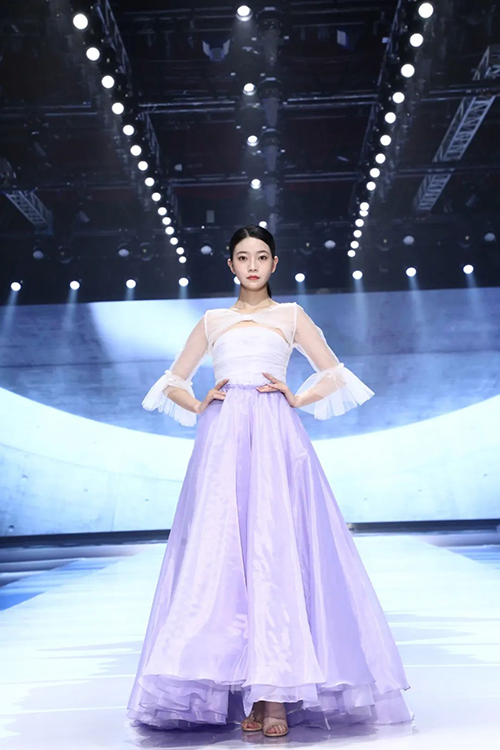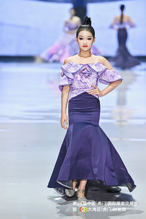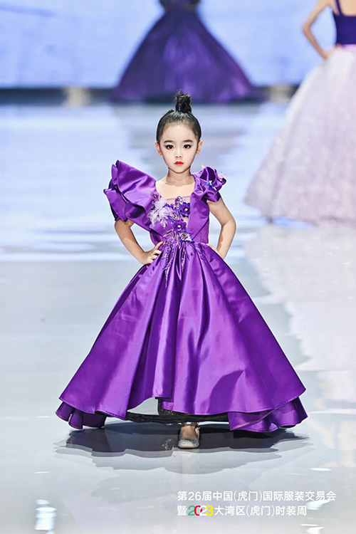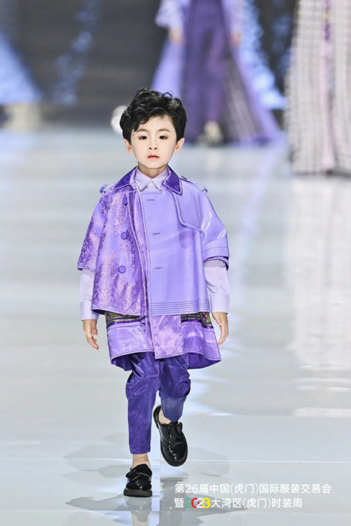 中國十佳童裝設計師、廣東省十佳服裝設計師、富民首席服裝設計師——馮璐表示,以莫奈為代表的印象派畫家曾經深深地迷戀紫色,莫奈對光影與色彩進行了深入研究,常大膽地以紫色作為主色調來創作,因此針對本季作品的流行趨勢,在色調方面,迷人又治愈的紫色自然成為最佳選擇,相信紫色作為金色陽光的互補色,能更好地表現光影的維度,使得作品與身體與環境更加具有強大的生命力。這次展示的作品在細節趨勢、面料趨勢和工藝趨勢方面,較以往都有很大的突破。