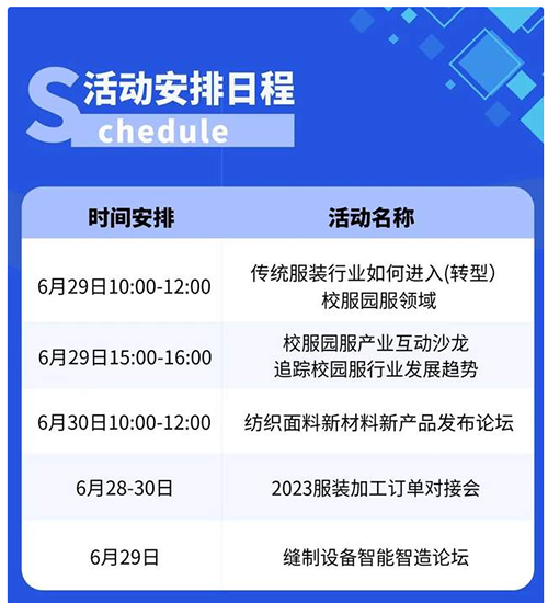 本次博覽會涵蓋「縫制設備展、印花工業展、面輔料及紗線展、職業裝團服展、校服園服展、服裝供應鏈及制帽展、皮革鞋機鞋材展」七大主題,展覽面積逾7萬㎡,展出國內外1500余家知名品牌,攜全行業的展品和新技術,在展會配套活動方面,既有傳統的服裝訂單對接會、數碼印花解決方案研討會等活動,又有創新校服園服設計大賽、傳統服裝行業轉型、紡織面料新材料、智能智造論壇等產業升級等活動,助力紡織服裝制鞋全產業鏈融合升級。