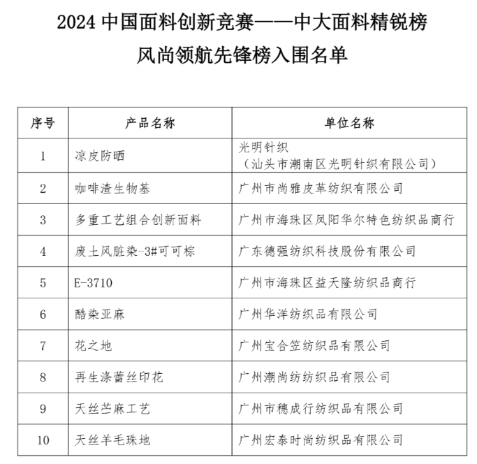 | 聚焦創(chuàng)新,引領(lǐng)風(fēng)潮!“2024中國(guó)面料創(chuàng)新競(jìng)賽——中大面料精銳榜”之風(fēng)尚領(lǐng)航先鋒榜出爐 |