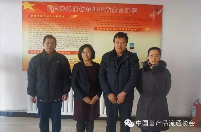中國畜產品流通協會常務副會長倪靜(左二)與阿拉善盟供銷合作社主任馬能才(右二)、青海柴達木絨業有限公司副總經理馬光(左一)等人合影。