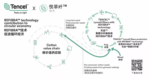 REFIBRA?悅菲纖?技術基于TENCEL?天絲?標準型萊賽爾纖維高效閉合式生產工藝,將生產服裝剩下的大量廢棉升級再造,與木漿一起成為原料,用于生產以天然環保著稱的TENCEL?天絲?品牌萊賽爾纖維。