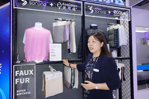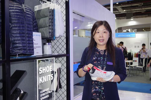 ![]() 翁經(jīng)理還為記者介紹了展會(huì)上展出的一些全新的產(chǎn)品,也是他們此次的創(chuàng)新產(chǎn)品?!斑@是我們的一條新產(chǎn)品線,是以SORONA?為材料的人造毛皮,所以,我們根本沒使用真動(dòng)物毛皮,也可以制作出柔軟親膚、外觀美麗的毛皮面料。另一條新產(chǎn)品線是用SORONA?和再生聚酯纖維制成的保暖材料,用于仿羽絨的填充,不僅保暖值高,還具有更強(qiáng)的可持續(xù)發(fā)展理念?!贝送?,杜邦公司也開始更多地涉足鞋類面料應(yīng)用開發(fā),這樣鞋面針織部分可以有更好的彈性回復(fù)性,讓消費(fèi)者有更加舒適的運(yùn)動(dòng)體驗(yàn)。同時(shí),也和其他優(yōu)秀的材料企業(yè)合作,如賽得利公司,用他們的環(huán)保型粘膠纖維優(yōu)可絲?和SORONA結(jié)合,生產(chǎn)出柔軟親膚且更具功能性的高品質(zhì)面料。
