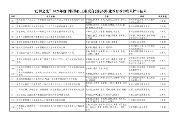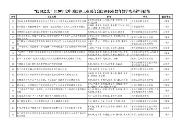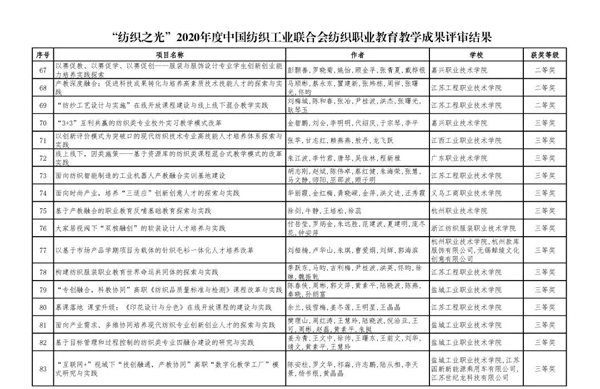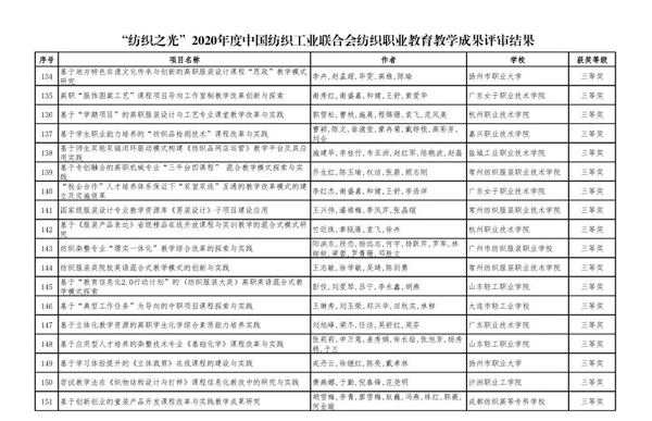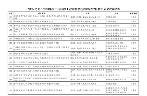 各有關(guān)單位: 根據(jù)國務(wù)院發(fā)布實(shí)施的《教學(xué)成果獎(jiǎng)勵(lì)條例》和《中國紡織工業(yè)聯(lián)合會(huì)紡織職業(yè)教育教學(xué)成果獎(jiǎng)勵(lì)辦法》,經(jīng)中國紡織工業(yè)聯(lián)合會(huì)紡織教育教學(xué)成果獎(jiǎng)勵(lì)評(píng)審委員會(huì)審定,中國紡聯(lián)批準(zhǔn),“紡織之光”2020年度中國紡織工業(yè)聯(lián)合會(huì)紡織職業(yè)教育教學(xué)成果獎(jiǎng)授獎(jiǎng)項(xiàng)目共171項(xiàng),其中:授予江蘇工程職業(yè)技術(shù)學(xué)院陳志華等申報(bào)的“依托平臺(tái)協(xié)同創(chuàng)新,產(chǎn)教融合協(xié)同育人,助力紡織行業(yè)協(xié)同發(fā)展的實(shí)踐”等18項(xiàng)教學(xué)成果一等獎(jiǎng),獎(jiǎng)勵(lì)金額1萬元/項(xiàng);廣東女子職業(yè)技術(shù)學(xué)院謝盛嘉等申報(bào)的“基于‘校企合作工作室’的高職服裝與服飾設(shè)計(jì)專業(yè)項(xiàng)目化教學(xué)模式改革與實(shí)踐”等51項(xiàng)教學(xué)成果二等獎(jiǎng);嘉興職業(yè)技術(shù)學(xué)院金智鵬等申報(bào)的“‘3+3’互利共贏的紡織類專業(yè)校外實(shí)習(xí)教學(xué)模式改革”等102項(xiàng)教學(xué)成果三等獎(jiǎng)。以上獎(jiǎng)勵(lì)金由紡織之光科技教育基金會(huì)資助。 希望全行業(yè)要認(rèn)真落實(shí)黨中央對(duì)紡織工業(yè)轉(zhuǎn)型升級(jí)的總體要求,鼓勵(lì)紡織服裝院校積極深化教學(xué)改革,彰顯“做中學(xué)、做中教”的紡織教育教學(xué)改革的特點(diǎn),開拓創(chuàng)新,提高紡織教育教學(xué)水平和教育質(zhì)量,全面促進(jìn)和推動(dòng)紡織行業(yè)發(fā)展。 “紡織之光”2020年度中國紡織工業(yè)聯(lián)合會(huì) 紡織職業(yè)教育教學(xué)成果獎(jiǎng)獲獎(jiǎng)名單