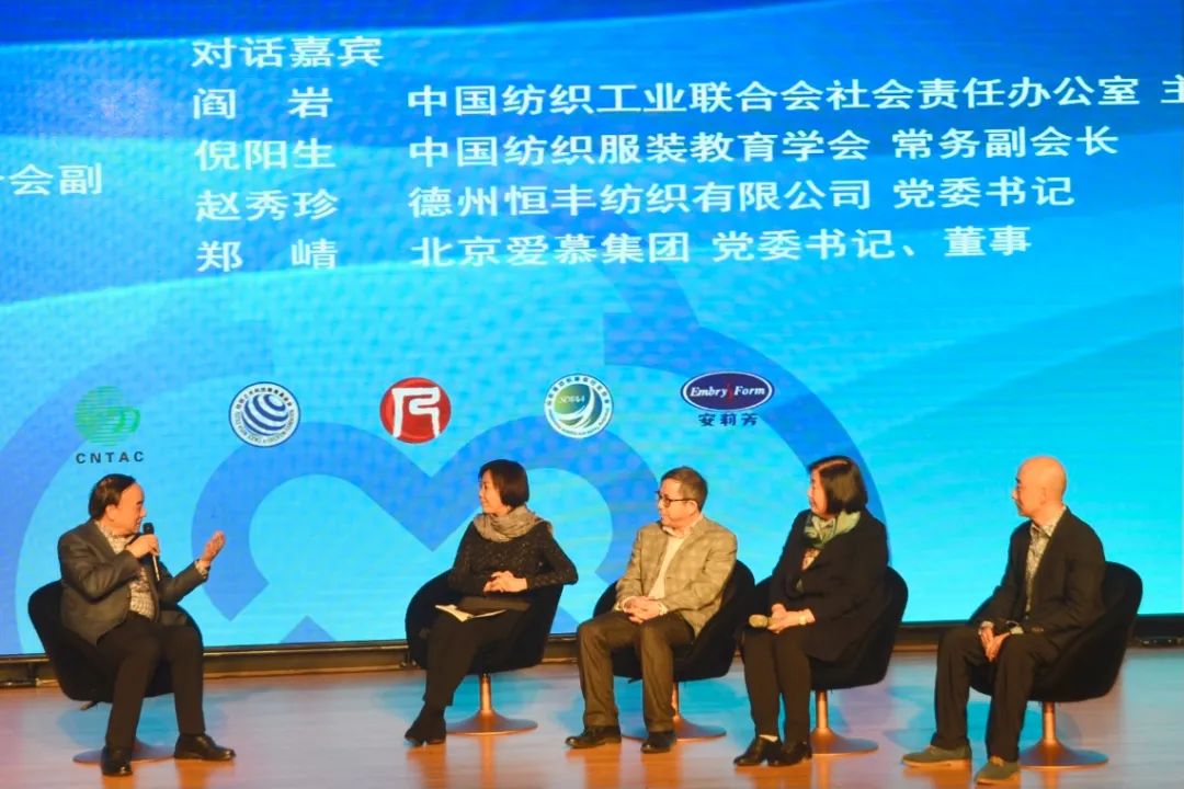 “責任.情懷與科教公益”對話由孫淮濱主持,中國紡聯社會責任辦公室主任閻巖,中國紡織服裝教育學會常務副會長、紡織之光科技教育基金會副理事長倪陽生,德州恒豐紡織有限公司黨委書記趙秀珍,北京愛慕集團黨委書記、董事鄭崝就行業科教公益事業推廣、紡織教學改革和人才培養、企業文化建設和企業家情懷以及善行發展等主題進行分享。