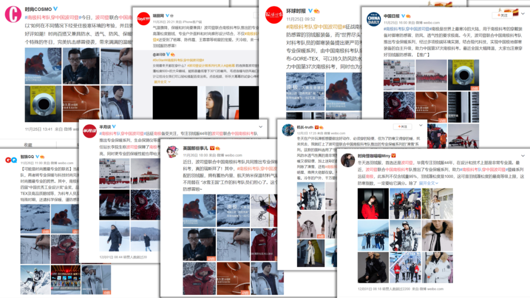 11月25日,波司登聯(lián)合中國(guó)南極科考推出的專業(yè)保暖系列正式發(fā)布,由南極科考隊(duì)員共同參與設(shè)計(jì)、并經(jīng)過(guò)極端環(huán)境實(shí)測(cè)。憑借專業(yè)的抗寒保暖能力和時(shí)尚的設(shè)計(jì)工藝,專業(yè)保暖系列瞬間成為時(shí)尚圈新晉保暖寵兒,“新一代種草王”王霏霏、人氣愛(ài)豆許佳琪等時(shí)尚icon第一時(shí)間就分享了波司登羽絨服的日常穿搭,成為大眾關(guān)注的焦點(diǎn)。