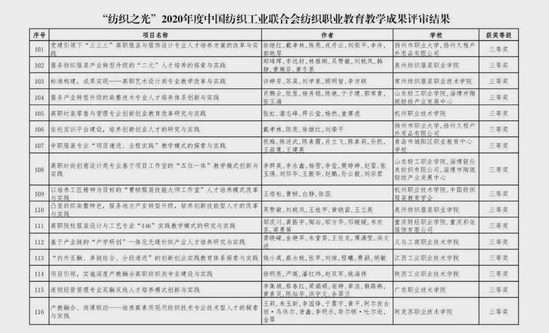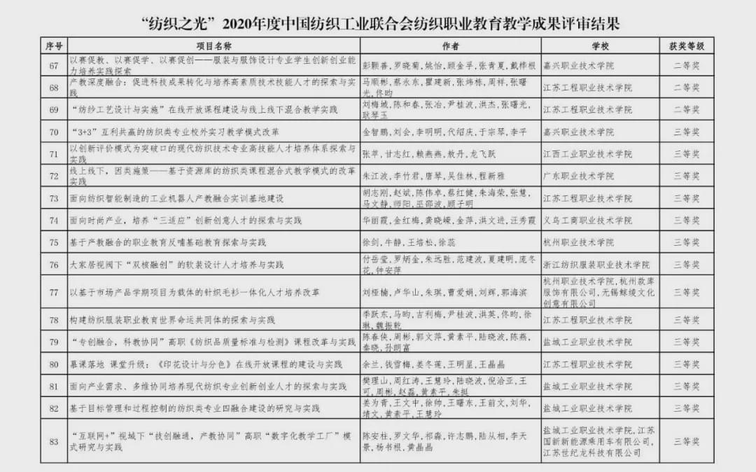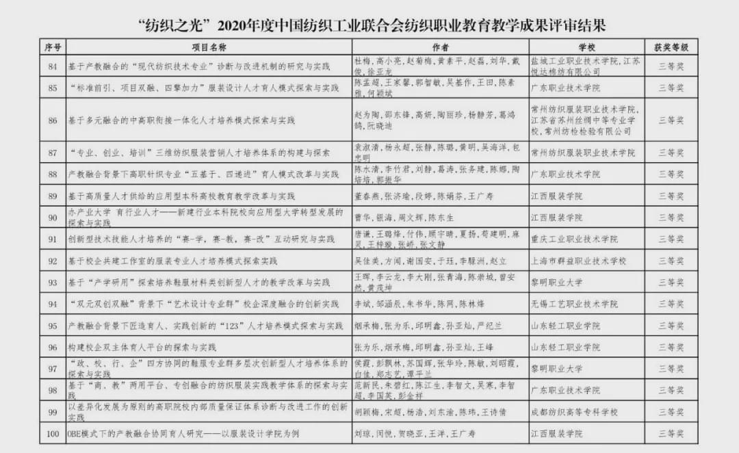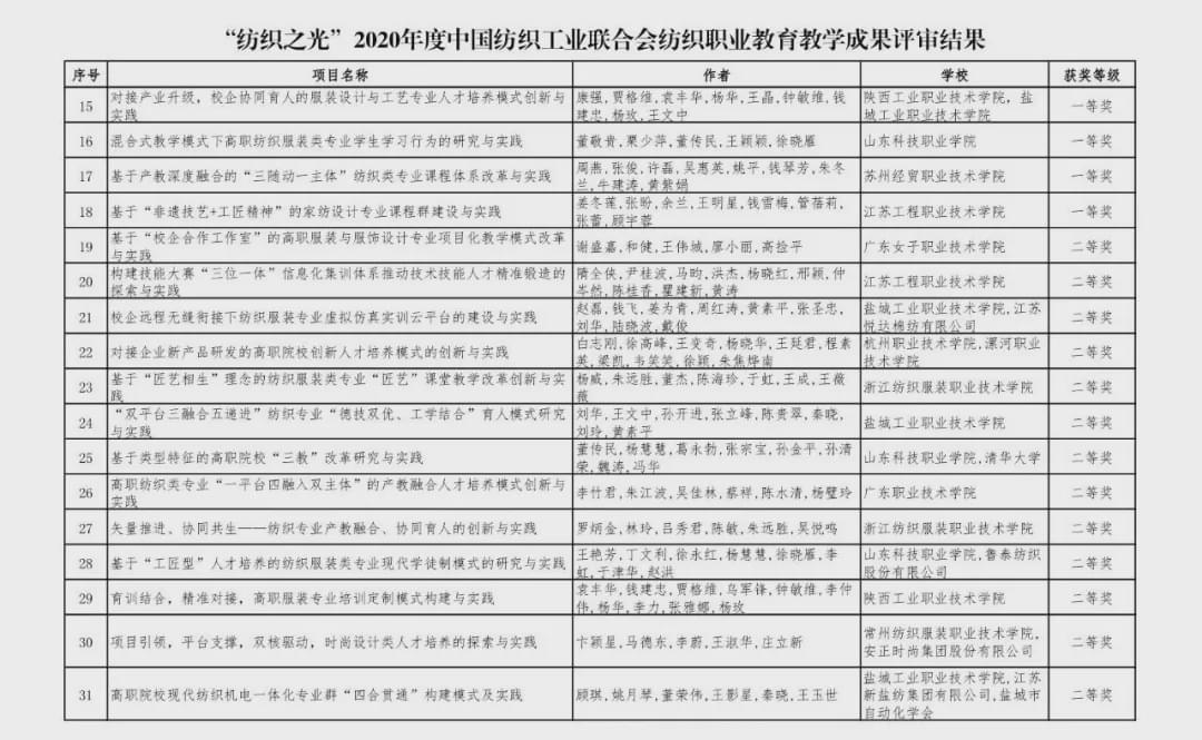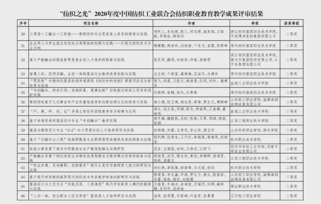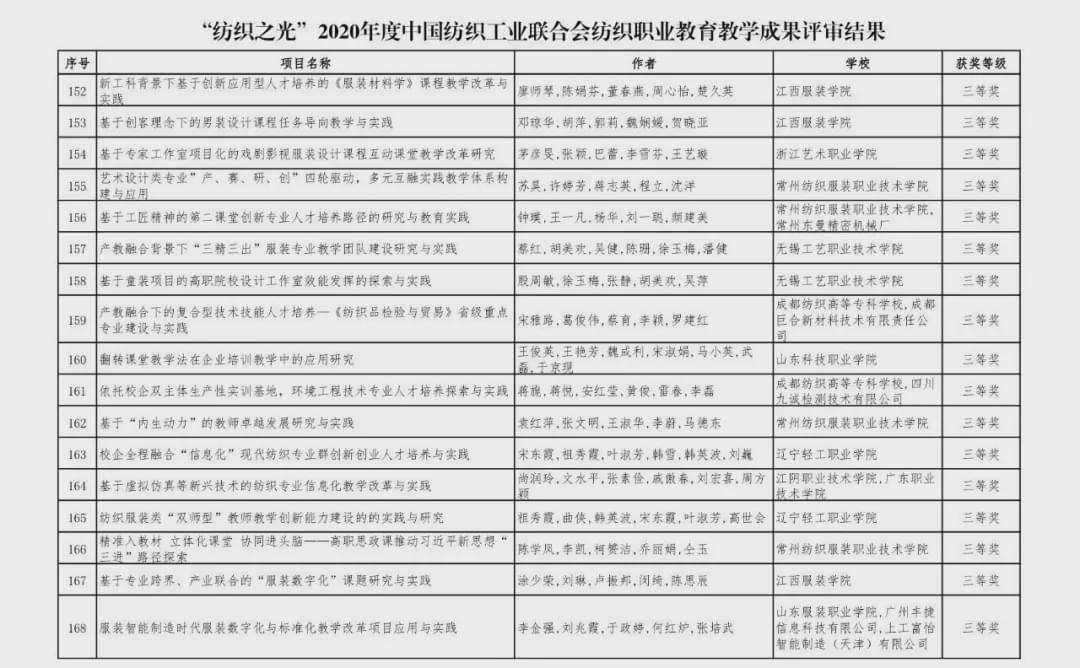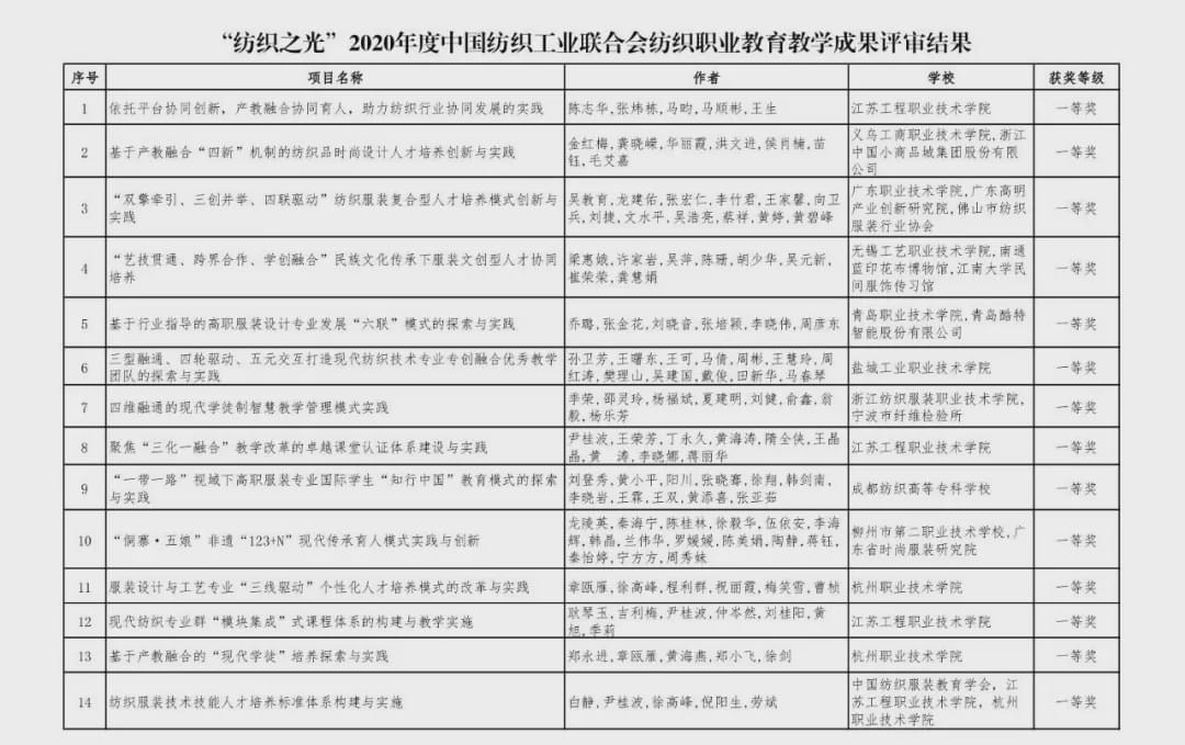 “紡織之光”2020 年度 中國紡織工業聯合會紡織職業教育教學成果獎