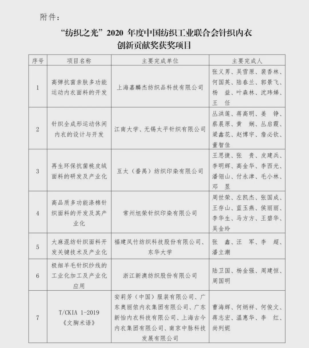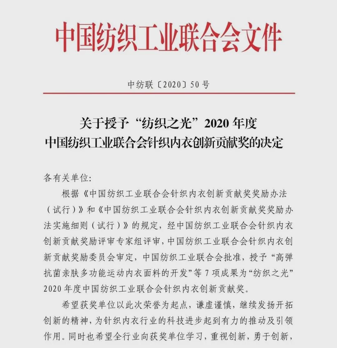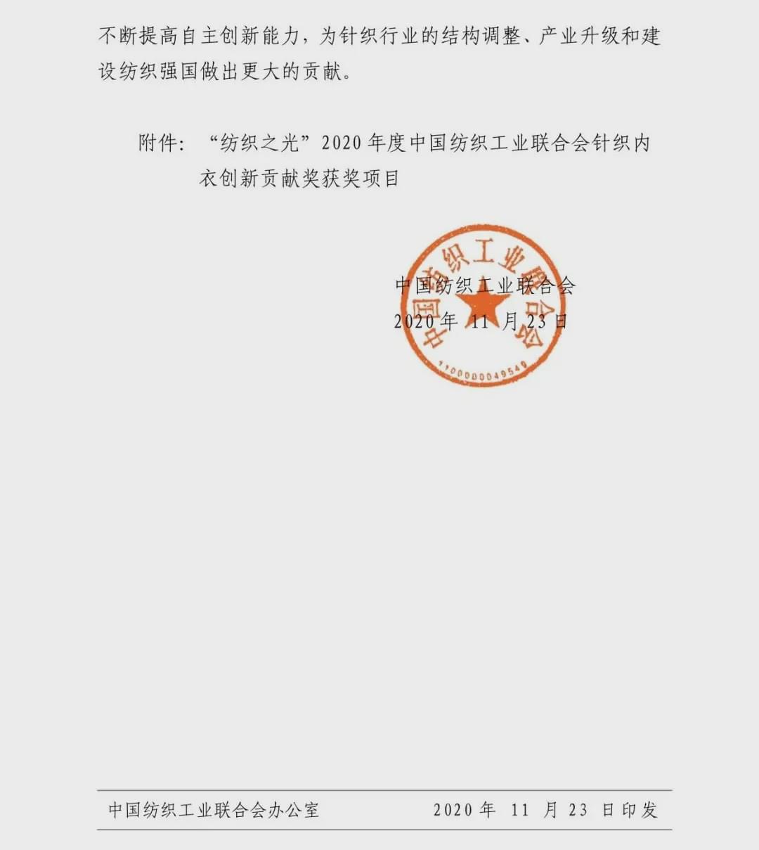 “紡織之光”2020 年度中國紡織工業聯合會針織內衣創新貢獻獎