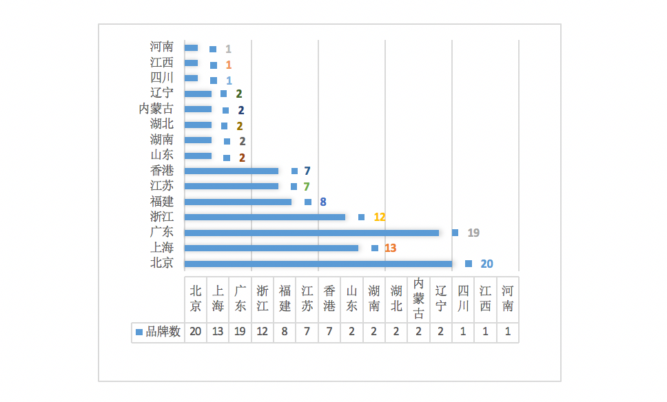 此外,值得一提的是,百強榜也描繪了中國的一批服裝品牌強省和強市從品牌的省、自治區、直轄市或特區分布看,北京20個,廣東19個,上海13個,浙江12個,福建8個,江蘇7個,香港7個,山東2個,湖南2個,湖北2個,內蒙古2個,遼寧2個,四川、江西和河南各1個(參圖2)。 圖2 各省、自治區、直轄市或特區的百強榜品牌數