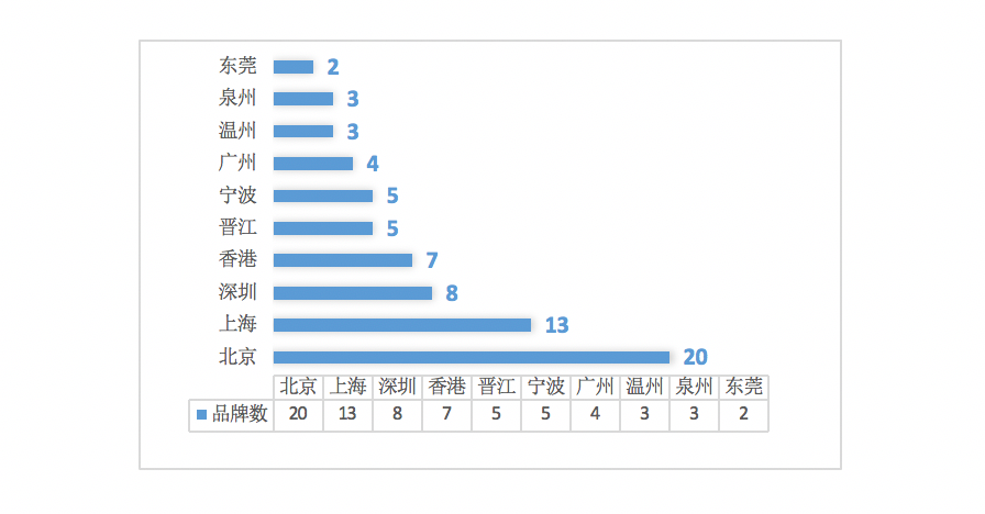 來源:北京服裝學院時尚傳播學院“國際時尚傳播研究與實踐”創新團隊、北京服裝學院時尚傳播研究中心。 從品牌的城市分布看,北京擁有20個,上海13個,深圳8個,香港7個,晉江5個,寧波5個,廣州4個,溫州3個,泉州3個,東莞2個(參圖3)。 圖3 各城市百強榜品牌數