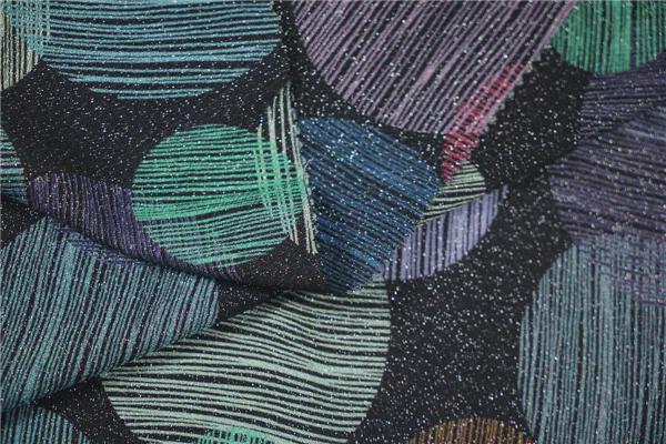 成分:粘膠63%,天絲31%,金銀絲6% 單位:深圳市佳多信紡織品有限公司 點評:融合超現實主義和迷幻電音風格,線描感大比例圓形層疊交錯,采用雙面印花技術,結合金銀絲的使用,呈現明暗對比的閃爍光澤,散發俏皮張揚的視覺感召力,營造前衛美感,展示數字未來感的現代風格。