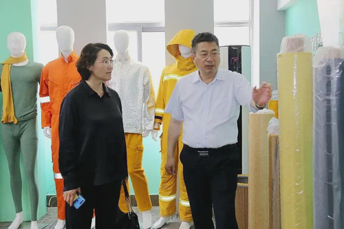 隨后,王士華帶領考察團參觀了企業產品展廳及聚酰亞胺纖維生產線,并詳細介紹了聚酰亞胺纖維的生產工藝及應用領域。奧神新材是全球首家采用干法紡生產聚酰亞胺的企業,創造性提出了“反應紡絲”制備纖維的新機理,創新并建立了聚合、紡絲、后處理的工藝與設備成套技術,開發了耐熱型、服用型和原液著色聚酰亞胺纖維生產技術,擁有“小批量、多品種、快響應、系列化”的柔性生產技術優勢。2016年,奧神新材聯合東華大學申報的“干法紡聚酰亞胺纖維制備關鍵技術及產業化”項目,榮獲國家科技進步二等獎。在產品展廳,高溫過濾氈、飛行員抗壓服、消防員滅火服、搶險救援服、各式防護頭套等甲綸Suplon?后道制品琳瑯滿目。