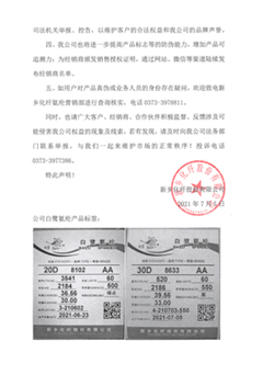 聲明表示,白鷺氨綸產(chǎn)地為河南新鄉(xiāng),不存在任何生產(chǎn)分公司或委托代工廠。請廣大客戶從新鄉(xiāng)化纖氨綸營銷部或官方合作的經(jīng)銷商購買白鷺氨綸產(chǎn)品,以免造成不必要的損失。對任何冒用、假借我公司名義進(jìn)行不法生產(chǎn)經(jīng)營的行為,將采取法律手段追究其侵權(quán)責(zé)任;如構(gòu)成犯罪,將依法向司法機關(guān)舉報、控告,以維護(hù)客戶的合法權(quán)益和品牌聲譽。此外,也將進(jìn)一步提高產(chǎn)品標(biāo)志等的防偽能力,增加產(chǎn)品可追溯力;為經(jīng)銷商頒發(fā)銷售授權(quán)證明,通過網(wǎng)站、微信等渠道陸續(xù)發(fā)布經(jīng)銷商名單。同時,也請廣大客戶、經(jīng)銷商、合作伙伴積極監(jiān)督、反饋涉及可能侵害我公司權(quán)益的現(xiàn)象及線索。