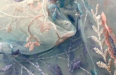 產品特點:運用柔軟的錦綸加密網紗刺繡,采用火腿紋的歐式花型設計,以淺色系的粉色、白色、淺藍、淺紫色作為配色。