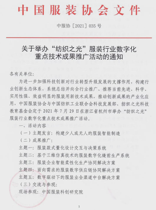 “紡織之光”服裝行業數字化重點技術成果推廣活動月底舉辦