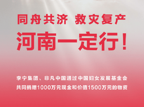 在了解到防汛救災具體需求之后,李寧集團、非凡中國通過全國婦聯中國婦女發展基金會共同捐贈1000萬元現金和價值1500萬元的物資,配合當地政府,重點用于受災群眾和一線救援人員的生活保障、災區健康防疫和災后恢復與重建工作。目前,現金和物資都已捐贈到位,首批物資已經裝車完畢,準備運往河南災區,我們在行動!同舟共濟,救災復產,河南一定行!