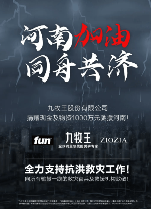 一方有難,八方支援,九牧王心系受災群眾,7月22日公司緊急決定,九牧王股份有限公司攜旗下品牌九牧王、FUN、ZIOZIA向河南捐贈現金及物資合計1000萬元,用于保障當地群眾人身安全、生活需求及支援災后恢復工作。