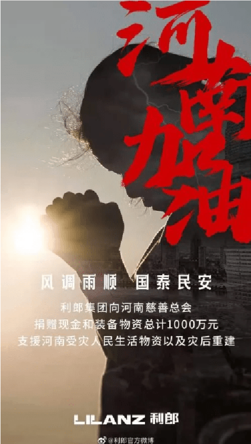 利郎集團通過河南慈善總會向災區人民捐贈現金及生活必備物資共計1000萬元。
