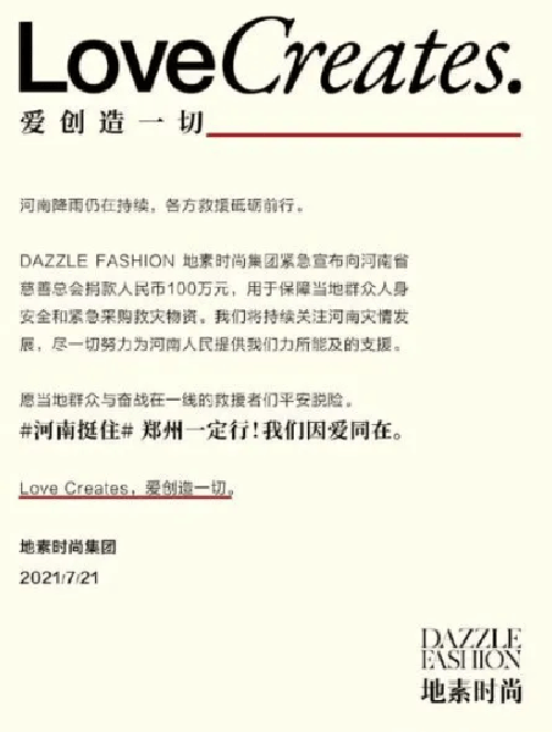 中國女裝品牌 Dazzle 的母公司,地素時尚集團宣布向河南省慈善總會捐款 100萬元,用于保障當地群眾的人身安全和緊急采購救災物資。