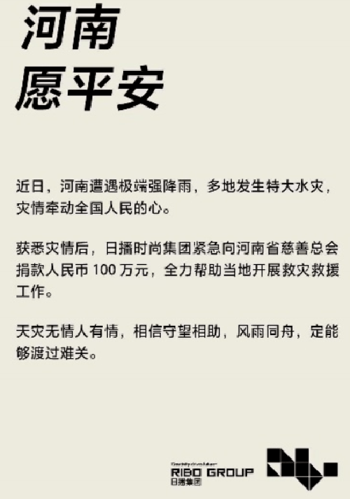 7月22日,日播時尚緊急通過河南省慈善總會捐助人民幣100萬元,全力幫助當地開展救災救援工作。此次,日播時尚第一時間火速馳援河南,再次用行動踐行了公司“生態發展、敬天愛人”的經營理念。災難當前,公司向奮斗在救災一線的工作人員致敬,也為受災群眾祈愿平安健康。