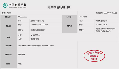 公司董事長王敏其代表河南災區感謝全體五洋人的捐贈與大愛!祝福河南同胞早日戰勝洪災,建設美好家園!祝全體五洋人心有大愛,闔家幸福!
