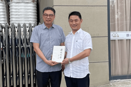 ![]() 葉志民向海寧市栩通新材料有限公司總經(jīng)理潘益森贈(zèng)送《錢之光傳》 |