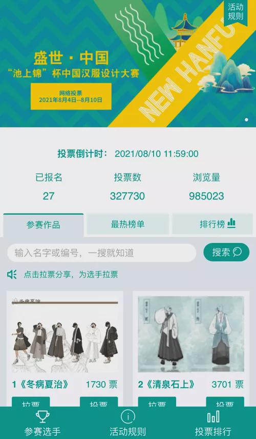 投票火熱 吸引百萬(wàn)流量關(guān)注 本次大賽網(wǎng)絡(luò)投票通道于8月10日11時(shí)59分正式關(guān)閉,自8月4日投票開(kāi)啟以來(lái),全網(wǎng)設(shè)計(jì)愛(ài)好者及漢服同袍們反響熱烈。25份初評(píng)入圍作品激烈角逐,共吸引了近百萬(wàn)人次參與互動(dòng),讓入圍選手們倍感興奮。 依據(jù)大賽組委會(huì)網(wǎng)絡(luò)投票環(huán)節(jié)規(guī)則,最終,11號(hào)選手余凌風(fēng)作品《曲韻腔調(diào)》獲得25090票,成為本次大賽名副其實(shí)的“人氣王”、“流量收割機(jī)”,率先捧走本次大賽的網(wǎng)絡(luò)人氣大獎(jiǎng)。