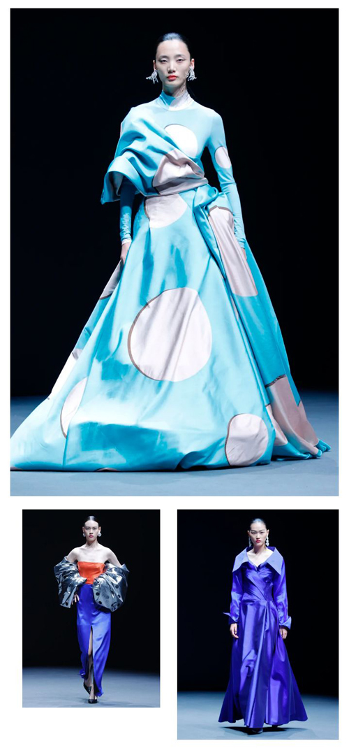 秀場保持一貫的簡約和復古,設計師將所有的力度都釋放在服飾上,不外露丁點兒“春光”,一切靠設計說話。復古爵士讓整場秀陷入一種從容的“微醺”中,可以忘卻一切“創傷”,在王鈺濤的“撫摸”中逐漸恢復如初。他的設計視野并不局限于服裝,而是構建了一種時裝建筑的敘事結構,營造出強烈的戲劇性,從立體結構處揮灑屬于自己的王者風范。本季,Beautyberry嘗試了更大膽的色彩,游移在“過分”的臨界點,毫厘間崩塌的錯覺呼應著疫情時代的苦難,崩潰前的治愈反而讓觀眾莫名松弛。在不規則褶皺和波點戲謔的對話中,偶爾出現的亮片閃爍著令人愉悅的光點。在情緒被撫慰的同時,王鈺濤并沒有松懈對性感線條的塑造,在利落復古的高級馬尾下流淌著細膩的曲線。生動地呈現50年代高級定制禮服的極致,又不拘泥于復古框架的局限,在節制的典雅中融入當代浪漫主義的微妙,賦予王鈺濤獨有的標簽:犀利的眼神背后溫暖的笑意,“炮制”美麗的同時讓你重新快樂。