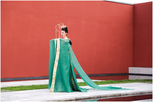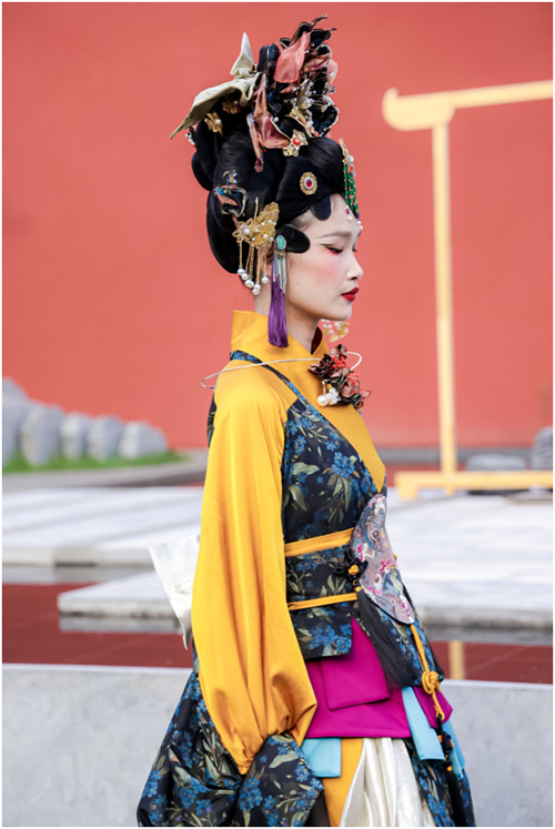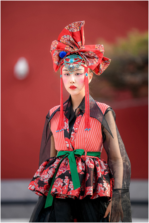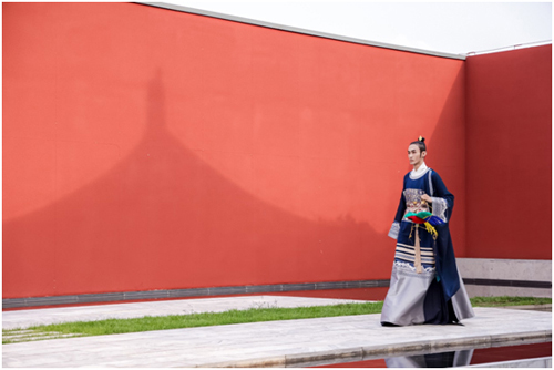 設計師張義超作品 身著創(chuàng)意漢服的模特與紅墻宮闕結合體現(xiàn)出別具風味的東方古典意境,宛如蘇軾那一句千古傳誦的名句——“不知天上宮闕,今夕是何年?”