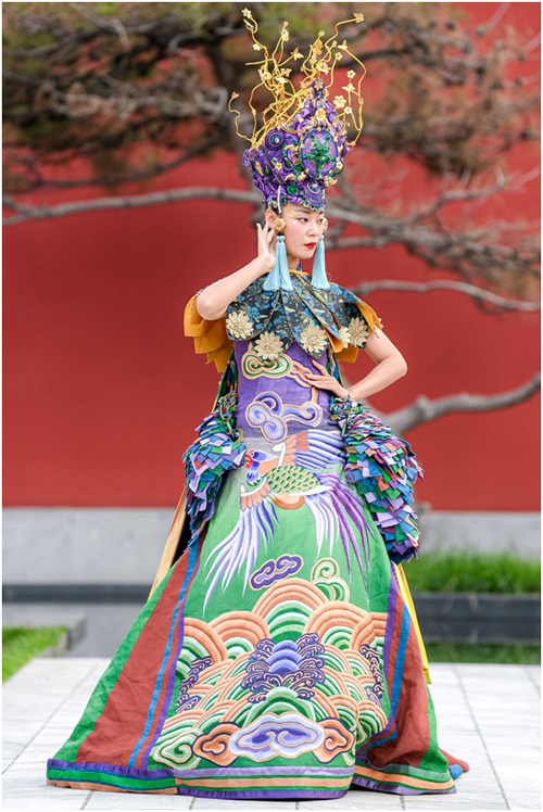 張義超作品五星出東方聯(lián)名款 本次設計作品結合了漢代服飾的特點:交領、系帶、右衽、寬袖、長袍、馬面裙等,點綴五星出東方文物上的紋樣,結合設計師本人一貫擅長的撞色-絳紫撞橘紅、孔雀藍撞綠等等,以傳統(tǒng)的手法來表現(xiàn)當代時尚和中國傳統(tǒng)文化融合,試圖喚起人們對傳統(tǒng)紋樣的熱情,從而將“五星出東方利中國”的這一中國傳統(tǒng)紋樣傳承下去。
