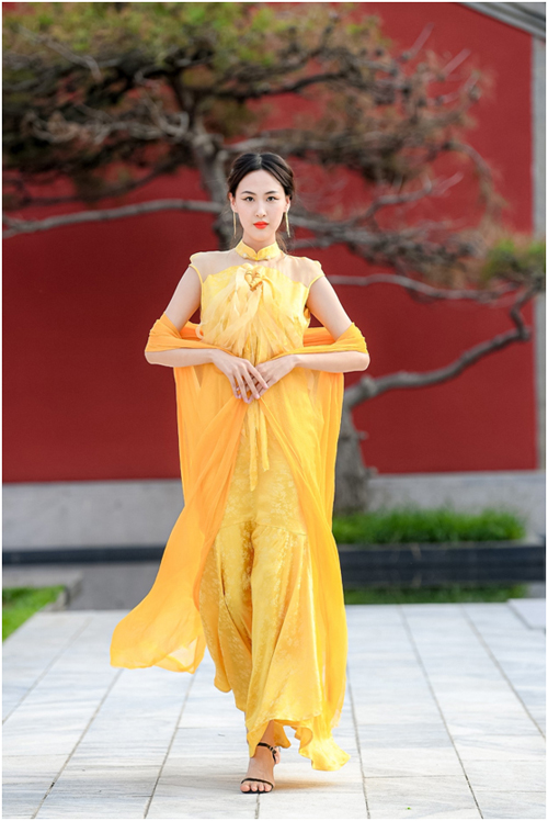 設計師張義超作品 愉悅YUE BAST首席設計師王恕兒本次作品“萬物幻彩染華章”則呈現(xiàn)出另一種風貌:服裝的色彩選擇融入敦煌色系的元素,從大自然中的獲取色彩靈感,以幻彩呈現(xiàn),簡約而典雅的廓型設計,采用廓形收腰等工藝設計加上桑蠶絲等天然面料的點綴,在順垂感中展現(xiàn)此系列的靈動脫俗之美。