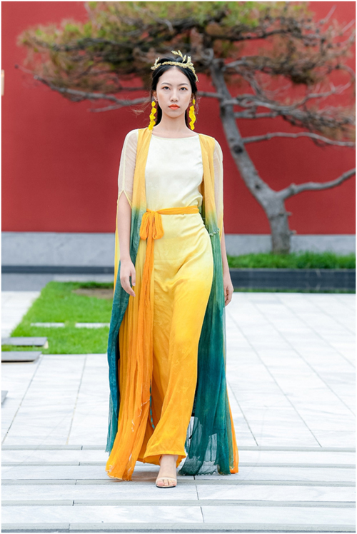 愉悅設計師王恕兒作品 本次發(fā)布作品采用中國紡織科學研究院江南分院及其特聘專家、植物染色非遺傳承人黃榮華先生共同研發(fā)合作植物染色技術,將古老的傳統(tǒng)印染工藝與現(xiàn)代工業(yè)相結合,實現(xiàn)合理有效的工業(yè)化中國時尚文化紡織產品的輸出。