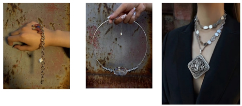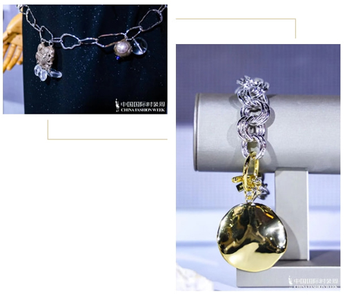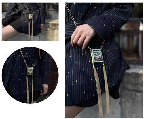 瓚兒品牌還長(zhǎng)期服務(wù)于時(shí)裝設(shè)計(jì)師秀場(chǎng)首飾搭配,為DEJIN,MARTINA QUEEN,聞所未聞等品牌提供過(guò)秀場(chǎng)首飾搭配。本季新品發(fā)布,特別是與服裝的搭配方面,設(shè)計(jì)師推出了當(dāng)下超級(jí)流行的金屬長(zhǎng)鏈小掛包,在景泰藍(lán)盒子老物件小包下面綴以金屬長(zhǎng)流蘇,顯得既年輕又別致,絕對(duì)吸睛。還有925銀鍍金鏈子腰帶,上綴有老物件獅子鎖與白水晶,系在腰間,頓時(shí)令服裝生色不少,整體造型現(xiàn)代而時(shí)尚。