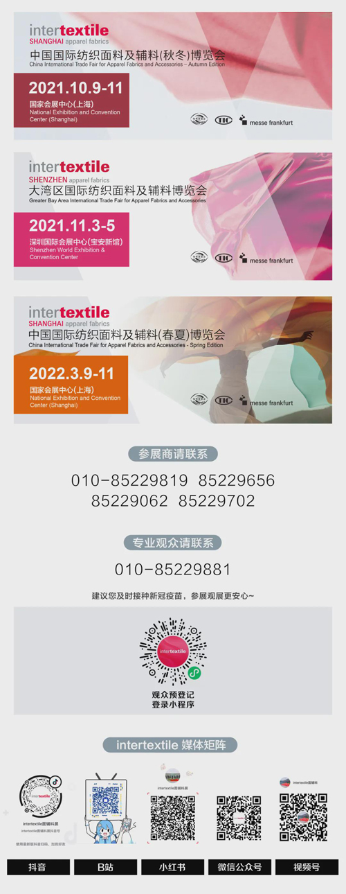 當前,中國紡織工業強國目標已基本實現。今年6月,中國紡織工業聯合會發布《紡織行業“十四五”發展綱要》及《科技、時尚、綠色發展指導意見》,明確了“十四五”時期紡織行業在整個國民經濟中的定位,提出了2035年行業的遠景目標。 藍圖已繪制,奮進正當時。金秋10月,中國紡聯秋季聯展再度集結行業精銳,開啟“十四五”新征程。 五大專業展,匯聚產業鏈同頻共振 從面料、紗線到家紡、服裝、針織,五大展會規劃清晰、各具特色,匯聚全球優質紡織服裝產品,集結產業鏈、供應鏈、價值鏈同頻共振。一項項新技術、新產品和新趨勢,展示的是信心與行動,描繪的是未來與藍圖。 intertextile面輔料展