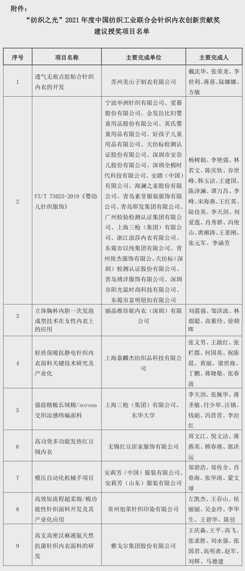| 2021年度“紡織之光”中國紡聯針織內衣創新貢獻獎授獎項目公示 |