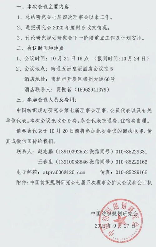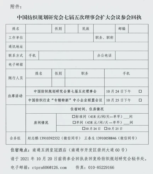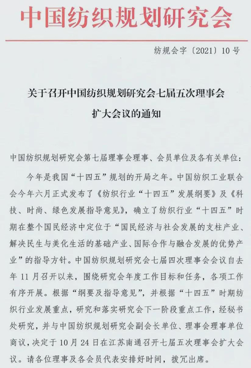 中國紡織規(guī)劃研究會七屆五次理事會擴大會議即將舉行