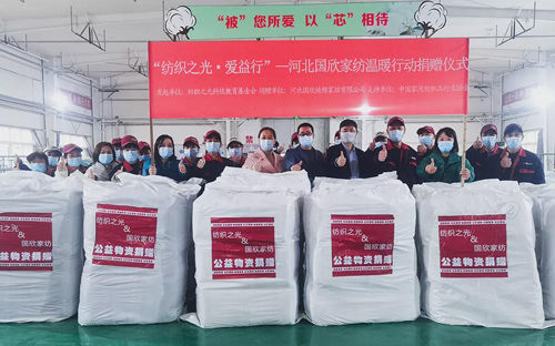 據(jù)了解,2008年汶川地震的時(shí)候河北國(guó)欣純棉家紡開(kāi)始捐送棉被5500條,公司上到董事長(zhǎng)下到基本員工全體連夜加班加點(diǎn),兩天時(shí)間做出5500條棉被,專車送往汶川。2019年開(kāi)始,每年入冬前為四川大涼山孤寡老人和孩子組織捐贈(zèng)一批厚被子。
