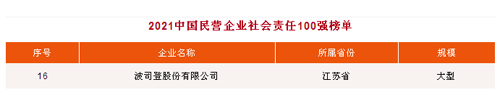 | 波司登榮登2021中國民營企業社會責任百強榜單 |