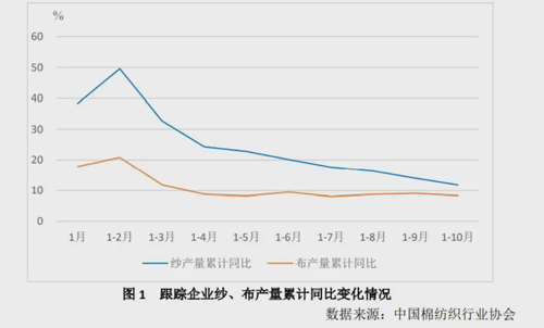 當(dāng)前棉紡織行業(yè)產(chǎn)能逐步向智能化、自動(dòng)化、綠色化的方向發(fā)展,企業(yè)設(shè)備生產(chǎn)效率提高,棉紡織企業(yè)設(shè)備利用率不斷提升,逐步達(dá)到甚至好于疫情前 2019 年的水平,紗、布產(chǎn)量同比持續(xù)增長(zhǎng)。中國(guó)棉紡織行業(yè)協(xié)會(huì)(以下簡(jiǎn)稱(chēng)“中棉行協(xié)”)跟蹤的 260 余戶棉紡織企業(yè)數(shù)據(jù)顯示,截至2021年10 月,跟蹤企業(yè)紡紗、織造設(shè)備利用率分別為 94.6%和 91.4%,同比分別提高 1.3 和 1.5 個(gè)百分點(diǎn),其中,紡紗設(shè)備利用率高于 85%的企業(yè)占比 86%,織造設(shè)備利用率高于 85%的企業(yè)占比 85%。1-10 月,棉紡織企業(yè)紗產(chǎn)量累計(jì)同比增長(zhǎng) 11.81%,布產(chǎn)量累計(jì)同比增長(zhǎng) 8.42%。