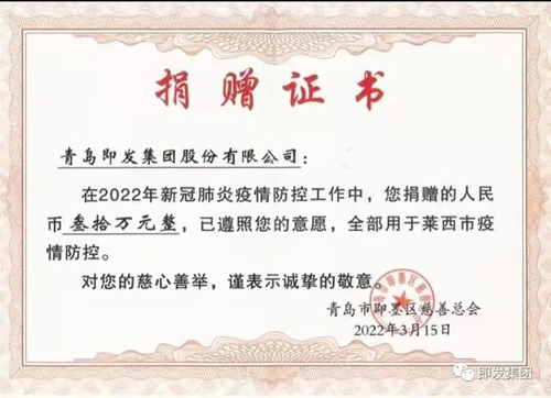 ![]() 即發(fā)集團(tuán)副總經(jīng)理周遵琳表示:“近日,萊西嚴(yán)峻的疫情形勢牽動即發(fā)人的心,為萊西抗疫盡一份綿薄之力是我們義不容辭的責(zé)任。即發(fā)一直致力于慈善事業(yè),2020年疫情發(fā)生后,企業(yè)捐款200萬用于即墨疫情防控。”