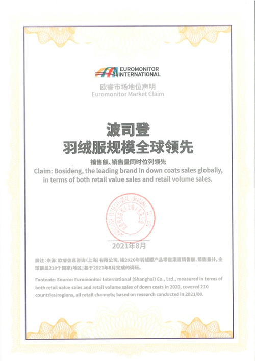 2021年8月,世界權威市場調查機構歐睿國際發布了2020年全球羽絨服調研報告,根據報告顯示,波司登羽絨服的規模全球第一,銷售額、銷售量同時位列第一。2022年又入選“全球最具價值服飾品牌50強”,波司登正受到全球市場的青睞與關注,品牌全球影響力穩步提升。