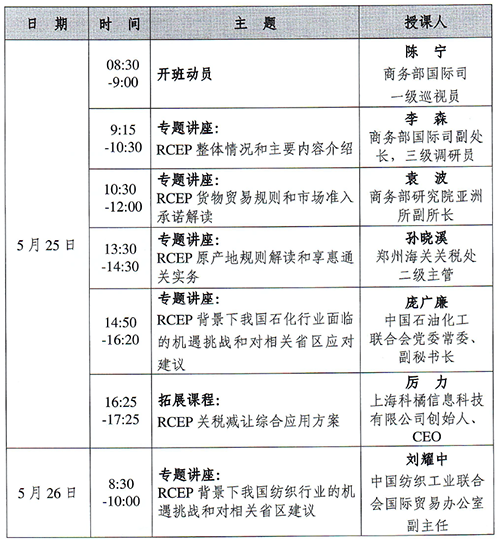 RCEP整體情況和主要內容介紹;RCEP貨物貿易規則和市場準入承諾解讀;原產地規則解讀及享惠通關實務;RCEP背景下我國紡織行業面臨的機遇挑戰和應對建議;RCEP成員國貿易投資風險提示等。