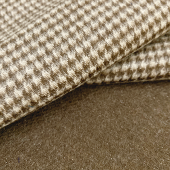 產品特點:原色牦牛絨純紡半精梳紗線(原色棕)與毛/絨原色混紡精梳紗線(原色駝)以一定比例規則排列,織成表層犬牙、里層斜紋的雙層結構。