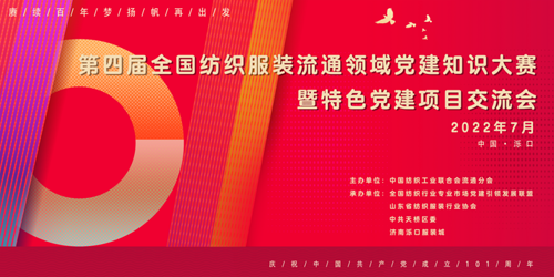 2022年是進(jìn)入全面建設(shè)社會主義現(xiàn)代化國家、向第二個(gè)百年奮斗目標(biāo)進(jìn)軍的重要一年。做好新時(shí)代基層黨建工作,必須堅(jiān)持用黨的創(chuàng)新理論武裝思想、指導(dǎo)實(shí)踐、推動工作。為進(jìn)一步強(qiáng)化黨員使命意識和責(zé)任擔(dān)當(dāng),更好凝聚精神力量,以優(yōu)異成績迎接黨的二十大勝利召開,第四屆全國紡織服裝流通領(lǐng)域黨建知識大賽暨特色黨建項(xiàng)目交流會將于7月21-22日在山東省濟(jì)南市舉辦。