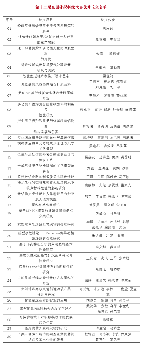 ![]() 中國針織工業協會專家技術委員會常務副主任、上海嘉麟杰紡織科技有限公司副總經理楊啟東宣讀了《關于表彰第十二屆全國針織科技大會優秀論文的決定》,《經編雙針床紗架賈卡豎條問題研究和解決》等30篇論文獲評第十二屆全國針織科技大會優秀論文(名單附后)。