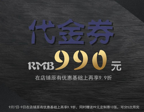 4、9月1日-29日在店鋪原有優(yōu)惠基礎(chǔ)上再享9.9折,同時(shí)贈(zèng)送99元定制券10張,可分5次用完。