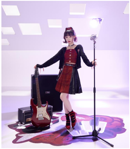 而【跳動音符】襯衫及背帶裙套裝則酷颯有活力,刺繡融入魚形音符、折扇及祥云,頗具流動感和韻律美。不對稱背帶裙呼應了“小喬-音你心動”的皮膚設計,仿馬面壓褶格裙自帶少女感,皮革拼接增添了幾分叛逆。